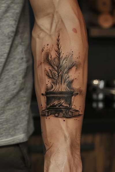 I really dig this tattoo it s got that down-to-earth, home-cooked feel that s perfect for anyone who loves the simplicity and authenticity of cooking over an open fire. The forearm placement makes it easily visible, a constant reminder of the joy and warmth that comes from preparing a meal with love. What s cool about this design is how it combines the elements of nature and cooking in such a seamless way. It s a piece that tells a story of tradition and the simple pleasures of culinary life, all wrapped up in a design that s both stylish and meaningful.