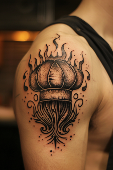 I have to admit, this tattoo is pretty awesome if you re a chef looking to make a statement. It s like wearing your passion for cooking right on your sleeve well, shoulder in this case and doing it with serious style. The flaming chef hat is such a cool metaphor for the heat and intensity of the kitchen, and it definitely sends the message that you re not just any cook; you re a culinary warrior. If you re looking to show off your dedication to the craft in a way that s both powerful and visually striking, this tattoo is absolutely it.
