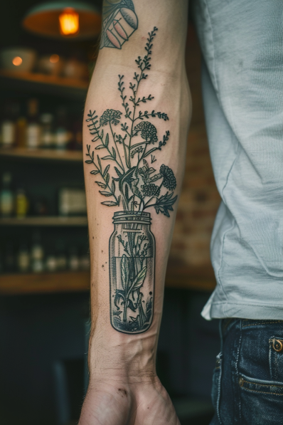 I really think this tattoo is a wonderful choice for anyone who loves cooking or has a passion for natural, earthy designs. The idea of preserving herbs in a jar is such a charming and nostalgic concept, and seeing it translated into a tattoo just feels right. It s a subtle yet meaningful design, perfect for those who appreciate the beauty of simplicity and the little things in life. Plus, the forearm placement makes it easy to admire and show off. If you re looking for a tattoo that s both elegant and connected to the culinary world, this one definitely fits the bill.