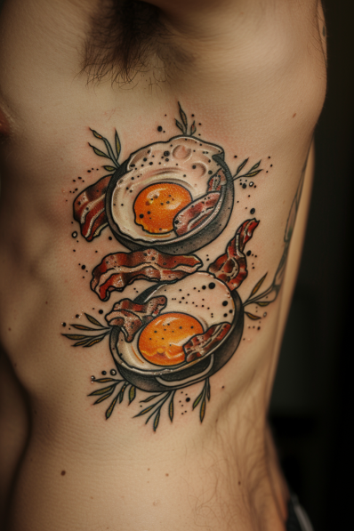 I have to say, this tattoo is a total winner for anyone who loves breakfast or just enjoys fun, food-themed body art. The rib placement gives it a unique twist, making the design both eye-catching and personal. What s great about this tattoo is its ability to take something as simple as bacon and eggs and turn it into a bold, stylish statement. It s playful, it s vibrant, and it s bound to bring a smile to anyone who sees it. Whether you re a chef, a foodie, or just someone who appreciates the most important meal of the day, this tattoo is a fantastic choice.