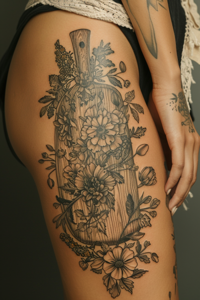 I think this tattoo is absolutely stunning, especially for someone who has a deep connection to both cooking and nature. The cutting board is such a symbolic choice, representing the heart of the kitchen, while the flowers add a soft, feminine touch that balances the design beautifully. The thigh placement is perfect for this large, detailed piece, allowing the art to flow naturally with the body s contours. It s a unique and meaningful tattoo that combines the love of culinary arts with the beauty of botanical elements, making it a truly special piece of body art.