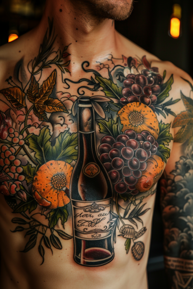 I think this tattoo is absolutely stunning, especially for wine lovers or anyone with a deep connection to vineyards and the art of winemaking. The way the design flows across the chest is just perfect, turning the body into a canvas that tells a story of passion, nature, and tradition. The combination of the bottle, grapes, and oranges gives it a warm, rustic vibe, almost like a tribute to the harvest season. It s a bold piece that s not only visually impressive but also rich in symbolism, making it a fantastic choice for those who want a tattoo that s both beautiful and meaningful.