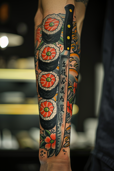 I ve got to say, this tattoo is a masterpiece for anyone who loves Japanese cuisine or just appreciates intricate, culturally rich designs. The full sleeve placement allows the art to flow seamlessly along the arm, making it a bold statement that s impossible to ignore. The combination of the sharpness of the knife with the softness and detail of the sushi rolls is really what makes this tattoo stand out it s a perfect balance of precision and artistry. If you re looking for a tattoo that s not just visually stunning but also pays homage to the culinary arts, especially sushi-making, this one s a clear winner.