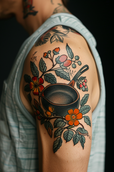 This tattoo is a vibrant and eye-catching piece featuring a classic frying pan surrounded by blooming flowers, all inked in a traditional tattoo style. The bold colors and clean lines bring the design to life, with the rich greens of the leaves and the bright oranges and reds of the flowers perfectly complementing the deep black of the pan. Placed on the shoulder, the tattoo has a balanced composition that flows naturally with the shape of the arm, making it a standout piece for anyone passionate about cooking.