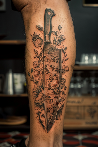 I think this tattoo is seriously cool, especially if you re someone who s passionate about the culinary world or butchery. The calf placement is perfect for showing off this bold design, and the combination of the cleaver with the flowers gives it a unique twist that balances toughness with a touch of elegance. It s like a nod to the hard work and craftsmanship that goes into the culinary arts, wrapped up in a visually stunning piece of ink. If you re into tattoos that tell a story and make a statement, this one is definitely a winner.