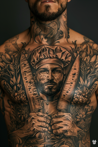This bold and impressive tattoo features a detailed portrait of a chef, positioned centrally on the chest, with the chef holding two large kitchen knives crossed in front of him. The design is incredibly detailed, capturing the intensity and pride in the chef s expression, with every wrinkle in the chef s hat and the texture of the knives meticulously inked. Surrounding the portrait are intricate floral elements, which add a touch of elegance to the otherwise strong and commanding image. The black and grey shading throughout the piece gives it depth and realism, making it a standout work of art.