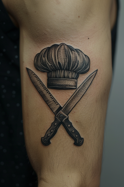 I think this tattoo is the ultimate symbol of culinary pride. It s like wearing your passion for cooking right on your sleeve literally! The crossed knives give off a vibe of skill and determination, while the chef s hat adds a touch of professionalism. The bicep placement is perfect for this design, making it visible when you want to show it off but easy to keep discreet when needed. If you re serious about your craft and want a tattoo that says you mean business in the kitchen, this one s a solid choice. It s classic, it s powerful, and it s definitely cool.
