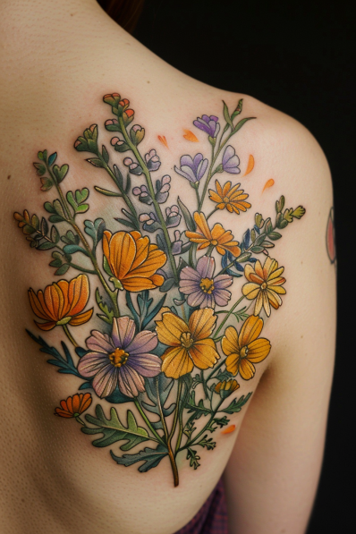 This stunning tattoo showcases an array of culinary herbs and spices, beautifully rendered in a watercolor style across the shoulder blade. The design features sprigs of fresh herbs like rosemary, thyme, and sage, intertwined with delicate blooms and soft leaves. The watercolor effect adds a dreamy, fluid quality to the tattoo, with the greens, yellows, and purples blending seamlessly to create a piece that feels alive and vibrant. The placement on the shoulder blade allows the design to flow naturally, complementing the body s shape and adding a touch of organic beauty.