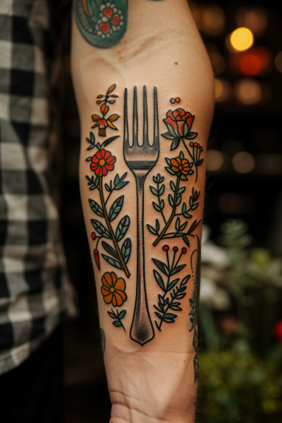 This vibrant tattoo features a simple yet striking design of a fork surrounded by a garden of colorful flowers, beautifully placed on the forearm. The fork, inked with clean, bold lines, stands as the central element, while the surrounding flowers add a lively burst of color and detail. The contrast between the metallic sheen of the fork and the soft, delicate flowers creates a balanced and visually pleasing composition. The use of bright reds, yellows, and greens in the floral elements makes the design pop, adding a cheerful and fresh vibe to the piece.