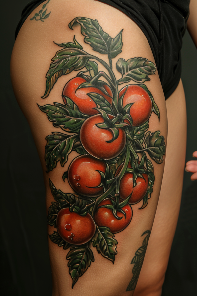 This vibrant tattoo showcases a lush vine of ripe, red tomatoes cascading down the thigh. The design is rich in color, with deep greens for the leaves and stems that contrast beautifully with the bright, juicy reds of the tomatoes. The shading and highlights make each tomato appear plump and almost ready to be picked, adding a lifelike quality to the piece. The vine s intricate details wrap around the thigh, making excellent use of the space and enhancing the natural curves of the body.