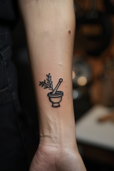 This charming tattoo features a small, minimalist mortar and pestle, perfectly inked on the forearm. The design is simple yet effective, with clean lines that capture the essence of this essential kitchen tool. A sprig of herbs peeks out from the mortar, adding a touch of nature and reinforcing the culinary theme. The placement on the forearm is ideal for this petite design, making it a subtle but meaningful piece of art.