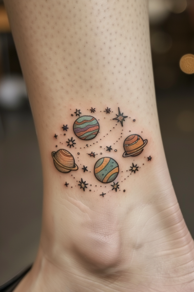 This adorable tattoo features a miniature solar system, with colorful planets orbiting around each other in a perfect circle. Each planet is detailed with soft shading and pastel-like hues of green, orange, and blue, giving the design a playful, almost cartoonish vibe. Tiny stars dot the background, adding a cosmic sparkle to the tattoo. Its small size and delicate details make it a perfect fit for the ankle, adding a fun and whimsical touch to this cosmic scene.