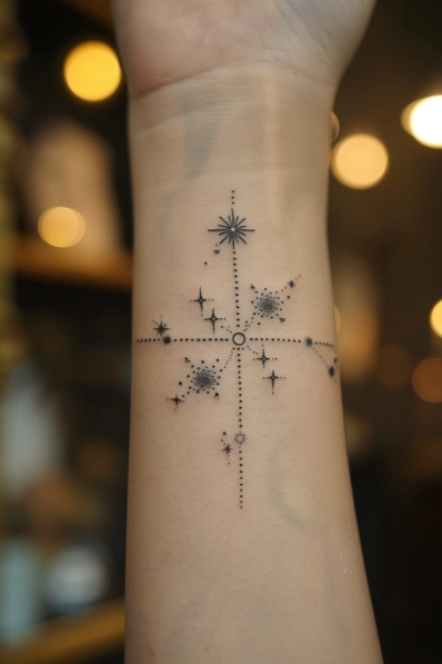I really dig the simplicity of this tattoo. It s small but packed with cosmic wonder, and it feels super meaningful without needing a lot of details. It s like a personal guide to the stars, right on your wrist, reminding you to look up and think about your place in the universe. The clean design makes it versatile and easy to pair with other ink too. Perfect for someone who loves a touch of space without going overboard!
