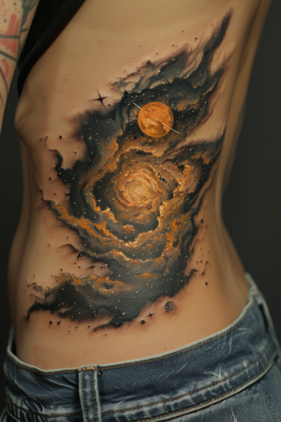 This breathtaking tattoo design portrays a swirling nebula, filled with rich shades of orange, yellow, and dark hues, creating a sense of cosmic energy and movement. At the heart of the nebula, a glowing planet sits prominently, surrounded by gaseous clouds that seem to stretch infinitely across the skin. The soft blending of colors gives the nebula a glowing effect, while the distant stars dotting the background add depth and a sense of vastness.
