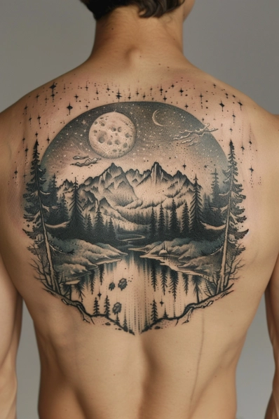 This tattoo features a stunning landscape scene under the glow of a full moon. Majestic mountains rise up in the background, while towering pine trees surround a calm, reflective lake below. The detailed shading and fine line work bring out the texture of the forest, the rippling water, and the craters on the moon, creating a serene nighttime wilderness vibe. The stars scattered throughout the sky give the whole piece a dreamy, celestial feel.