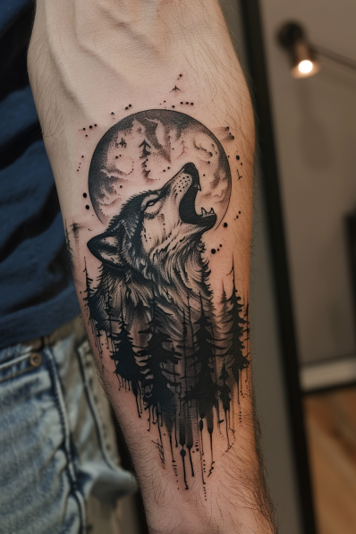 This tattoo showcases a majestic wolf howling beneath a full moon, set against the backdrop of a dense forest. The contrast of dark shading with the white highlights of the moon creates a haunting, powerful image. The trees fade into abstract ink splashes, adding a sense of mystery and blending nature with artistic abstraction. The wolf s fur is meticulously detailed, giving it a realistic yet slightly stylized look, while the moon above enhances the wild, primal energy of the design.