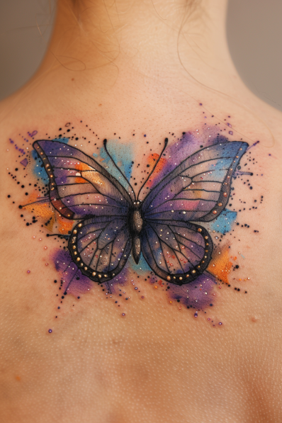 This vibrant tattoo showcases a stunning butterfly with intricate wings, set against a backdrop of watercolor splashes in shades of purple, blue, and orange. The delicate dotwork adds dimension and detail to the wings, while the colorful galaxy-like background gives the tattoo a dreamy, ethereal vibe. The butterfly appears to be illuminated by the cosmic colors, making it look as though it s floating in a galaxy of its own.