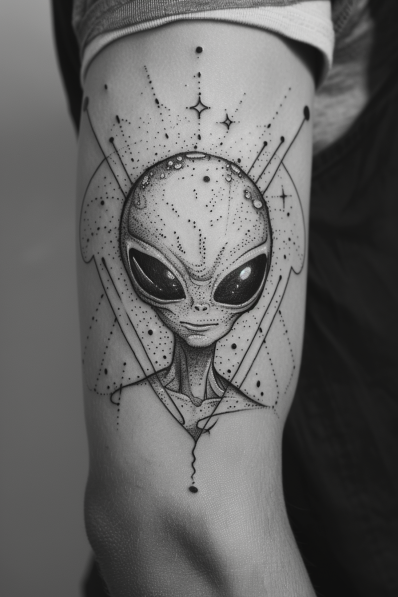 This bold tattoo features a detailed alien portrait with large, reflective eyes and a minimalist, geometric background. The alien s head is adorned with dotwork, giving it an otherworldly texture that blends realism with abstract artistry. Surrounding the alien are clean, symmetrical lines and stars, which add a cosmic feel while keeping the design sharp and modern. The use of black ink with fine detailing creates a striking contrast, making this tattoo stand out while maintaining an air of mystery.
