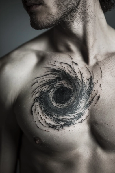 This intense tattoo depicts a swirling black hole in the center of the chest, with chaotic lines and splashes of dark ink spiraling inward. The design gives a sense of powerful energy being sucked into the void, creating a dramatic and mesmerizing effect. The use of abstract, rough brushstroke-like lines adds a raw, organic feel to the piece, while the deep black center perfectly captures the mysterious and infinite nature of a black hole.