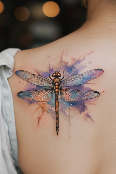 This mesmerizing tattoo features a beautifully detailed dragonfly with translucent, colorful wings, set against a stunning backdrop of galaxy-like colors in purples, blues, and oranges. The intricate details on the dragonfly s body, combined with the soft watercolor background, create a captivating contrast. The wings appear iridescent, shimmering in cosmic light, making the dragonfly look as though it s flying through a nebula.