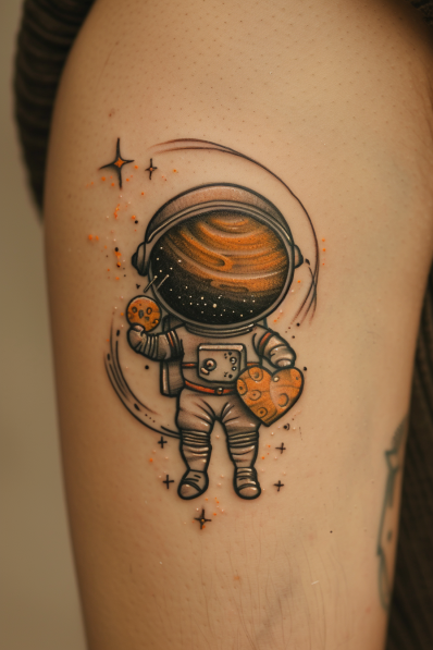 This adorable tattoo features a tiny astronaut holding a heart-shaped planet, blending cosmic charm with a touch of sweetness. The helmet showcases swirling galaxy colors, while the heart planet glows in warm orange hues, adding contrast to the overall design. Stars and subtle accents float around the astronaut, making it look like they re lovingly cradling a piece of space.