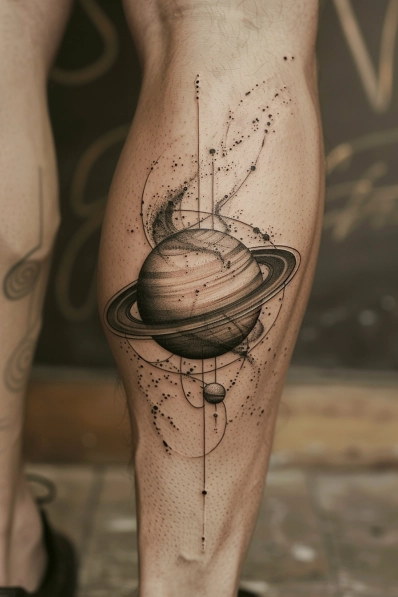 This stunning tattoo features a highly detailed and realistic depiction of Saturn, complete with its iconic rings and a smaller moon orbiting nearby. The artist has used fine lines and dotwork to create an intricate cosmic background, with a delicate vertical line running through the center of the design, giving it a sense of balance and symmetry. The shading on Saturn gives it an impressive three-dimensional feel, while the surrounding orbital lines and starry accents add a touch of abstraction, making it a visually striking piece.