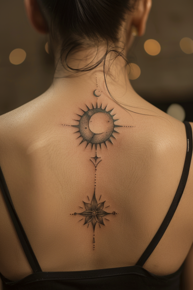 I love the dramatic vibe of this tattoo! The solar eclipse is such a powerful symbol of transformation and mystery, and the shading on the moon really gives it that shadowy, ethereal quality. It s a bold yet elegant design, perfect for someone who wants a tattoo that s both visually stunning and packed with meaning. Plus, the placement on the spine makes it even more mesmerizing!