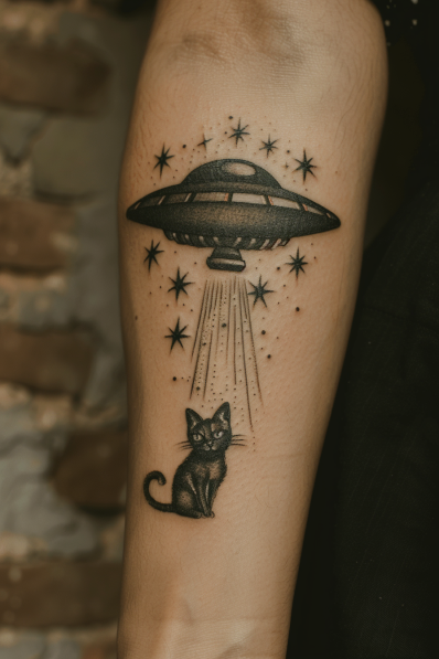 I m absolutely loving the humor and creativity in this tattoo! It s a perfect mix of sci-fi and adorable, with the cat just chilling as if it s totally cool with getting beamed up. The playful tone makes this tattoo both unique and full of personality. It s perfect for anyone with a love for cats and UFOs or just someone who enjoys a fun, offbeat design. Definitely a conversation starter!
