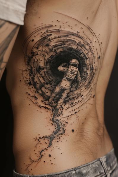 This dynamic tattoo features an astronaut floating toward a swirling wormhole, with incredible detail that draws you right into the scene. The circular vortex is filled with abstract lines and shadows, giving the illusion of depth and movement as the astronaut ventures deeper into the unknown. A jagged trail of stars and cosmic dust follows the astronaut, enhancing the feeling of drifting in space. The intricate design captures the thrill and mystery of space exploration.