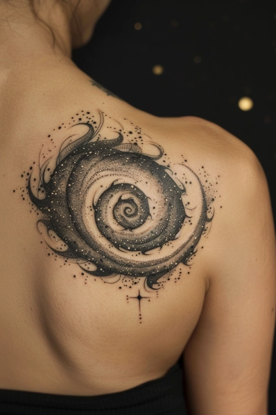 This beautiful shoulder tattoo features a swirling spiral galaxy, with soft, shaded lines and starry details creating a mesmerizing, cosmic effect. The galaxy spirals out from the center, with a mix of light and dark tones that give it depth and movement. Dotted stars are scattered throughout the design, enhancing the feeling that you re gazing into a distant corner of the universe. The overall design flows naturally with the contours of the shoulder, making it a perfect blend of art and anatomy.