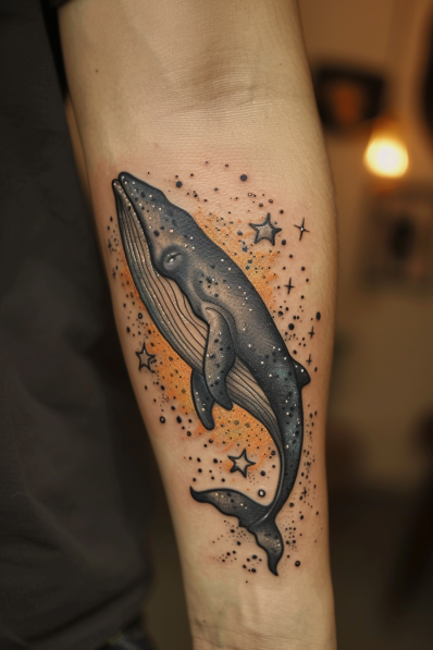This tattoo beautifully blends the majesty of the ocean with the wonder of the cosmos, featuring a graceful whale swimming through a starry sky. The whale s body is detailed with gentle shading, giving it a smooth, realistic texture, while small stars and cosmic dust surround it, as if it s floating in a celestial sea. The subtle orange backdrop adds warmth to the design, making the whale stand out even more against the cosmic background.