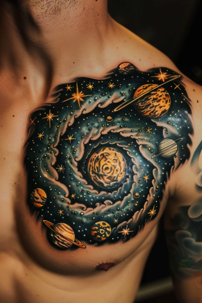 I ve got to say, this tattoo is a total showstopper. The colors pop beautifully, and the spiral shape gives the design so much movement it s like the universe is in constant motion on your chest! I also love how it perfectly balances between abstract and realistic; the planets are detailed, but the galaxy has a more artistic flair. Definitely an out-of-this-world piece for anyone obsessed with the mysteries of space.