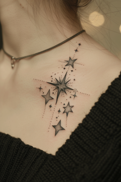 I ve got to say, this tattoo is both subtle and striking in all the right ways. The stars feel like a cosmic accessory, blending simplicity with a touch of glam. It s perfect for someone who wants a tattoo that s eye-catching but not too overwhelming. Plus, there s something undeniably magical about having a constellation sprinkled right on your collarbone it s like wearing a piece of the night sky. Super chic and cosmic!