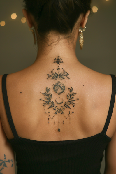 This elegant tattoo design is centered around lunar imagery, featuring a beautifully detailed moon surrounded by phases and decorative cosmic symbols. Delicate line work gives the tattoo an intricate, symmetrical pattern, enhanced by celestial elements like stars, crescent moons, and ornamental dots. The laurel-like branches framing the moon add a touch of nature to the overall cosmic vibe, creating a perfect balance between space and earth.