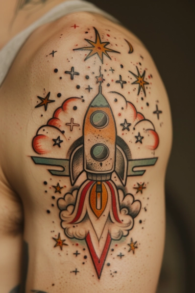 I absolutely love the vibe of this tattoo! It s got that perfect mix of fun and nostalgia, like something out of a 60s sci-fi flick. The color palette really pops, giving the whole design an upbeat, adventurous energy. Plus, who wouldn t want a rocket on their arm, symbolizing bold leaps into the unknown? It s a cool, lighthearted design that would definitely turn heads and bring a smile to anyone who loves space travel or retro aesthetics!