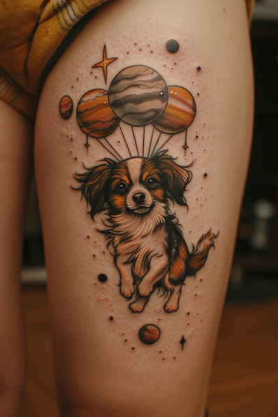 This playful and heartwarming tattoo features an adorable puppy floating through space, lifted by a bunch of planets tied like balloons. The planets, each detailed with soft shading and vibrant colors, add a fun cosmic touch, while the puppy s joyful expression gives the design a lively and whimsical feel. The planets include familiar favorites like Saturn and Jupiter, and the dotwork surrounding the tattoo adds depth and a sense of cosmic wonder.
