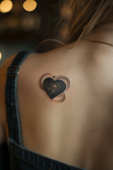 This unique tattoo blends a heart shape with the awe-inspiring visuals of a solar eclipse. The heart is shaded in black with soft gradients that mimic the glow of an eclipse, complete with subtle starry details inside. The surrounding lighter halo adds depth and a sense of cosmic wonder, making the heart look like it s glowing from within. It s simple, yet incredibly eye-catching with its clever use of shading and negative space.