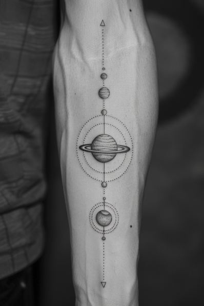 Honestly, this tattoo is perfect for anyone who loves clean, minimalist designs with a hint of cosmic wonder. The geometric alignment feels very modern and balanced, and it s subtle enough to be sleek but detailed enough to catch the eye. I really appreciate the use of Saturn at the center it s a nice touch that adds a bit of flair without overwhelming the simplicity of the piece. Definitely a cool option for someone who wants a space tattoo that feels timeless and artistic!