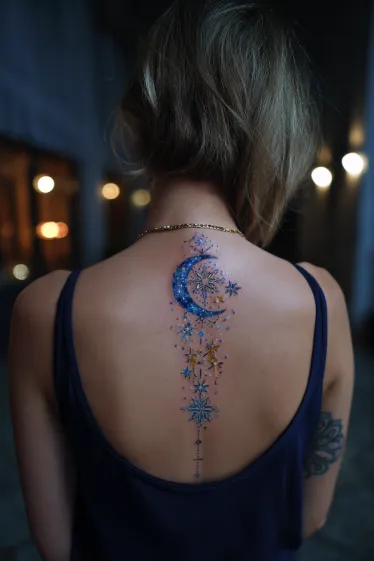 Honestly, I am completely captivated by how incredibly magical and beautifully intricate this tattoo is! The way the moon and all those sparkling stars flow down the spine feels so dreamy and full of cosmic energy. It s such an artistic and personal statement, and I think it would make anyone feel wonderfully connected to the mysteries of the universe and beautifully unique.