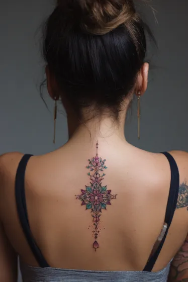 This absolutely enchanting spine tattoo features a stunning, intricate star-like flower at its very heart, bursting with vibrant shades of pink, purple, and teal, and surrounded by delicate green foliage. Extending gracefully both upwards and downwards from this central bloom are beautifully ornate and symmetrical geometric patterns, all rendered with fine lines and subtle details. The entire design creates a mesmerizing, continuous flow that perfectly traces the elegant curve of the spine.
