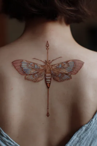 This absolutely breathtaking spine tattoo features a stunning moth design, rendered with incredibly fine details and a beautiful blend of soft pastel blues, pinks, and warm earthy tones. The moth s body and intricate wings are adorned with delicate patterns that give it an almost regal, antique feel. Extending both upwards from its head and downwards from its tail is a slender, ornate line with decorative elements, perfectly following the curve of the spine.