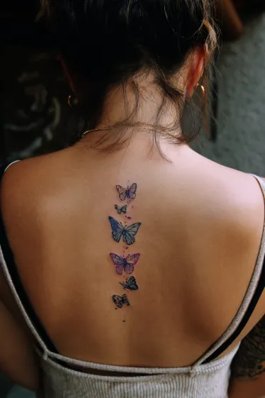I m totally captivated by how wonderfully delicate and symbolic this tattoo is! The way these colorful butterflies seem to take flight up the spine feels so liberating and full of grace, like a constant reminder of transformation and growth. It s such a beautifully subtle yet impactful design, and I think it would make anyone feel incredibly lighthearted, free-spirited, and utterly unique.