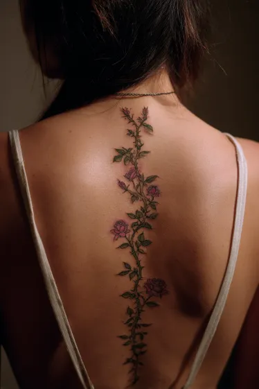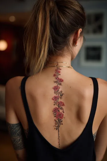Honestly, I absolutely adore how classic and beautifully feminine this rose vine tattoo is! The rich pinks of the roses are just so captivating, and the way they bloom and trail down the spine feels incredibly romantic and graceful. It s such a lovely way to celebrate enduring beauty and strength, and I think it would make anyone feel wonderfully elegant and confident with this stunning floral art.