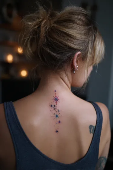 This absolutely charming tattoo features a delicate cascade of twinkling stars, gracefully descending along the spine like a personalized constellation. Each star, rendered in soft blues, purples, and hints of pink, varies in size and intricate detail, creating a whimsical and ethereal sparkle. The subtle dot work and fine lines give the entire piece a light, airy feel, as if a piece of the night sky has been gently placed on your back.