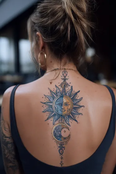 This absolutely enchanting spine tattoo beautifully depicts a celestial dance between the sun and the moon, symbolizing balance and harmony. The central sun, split into cool blue and warm golden halves, showcases a serene face, radiating intricate rays. Below it, a delicate crescent moon with swirling details mirrors the celestial theme. Elegant ornamental patterns, in complementary blue and gold tones, extend both above and below these central elements, creating a continuous, mystical flow along the spine.