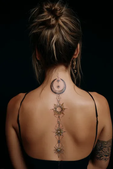 This absolutely mesmerizing spine tattoo features a stunning series of celestial elements, gracefully cascading down the back like a cosmic necklace. At the top, a beautifully detailed crescent moon with tiny stars gleams, leading into an intricate sunburst design with delicate rays. Below, two more sparkling stars, adorned with subtle golden accents and fine dot work, complete this ethereal composition. The entire piece radiates a sense of wonder and celestial elegance.