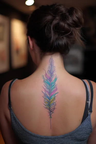 This captivating tattoo showcases a beautifully rendered feather, gracefully trailing down the spine with a stunning blend of pastel hues. The delicate barbs are colored in soft shades of blue, pink, purple, and yellow, giving it an ethereal, watercolor-like appearance. The intricate details and gentle shading create a sense of lightness and movement, making the entire piece feel incredibly airy and perfectly aligned with the elegant curve of the back.