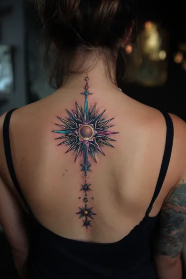 This enchanting spine tattoo features a vibrant, multi-pointed starburst or compass rose design as its central focus, boasting a gorgeous mix of teal, purple, and gold hues. It is beautifully centered on the upper back, with smaller, equally colorful stars and delicate dots trailing both upwards towards the neck and downwards along the spine. The detailed shading and bright colors give it a magical, almost cosmic glow.