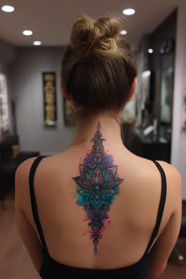 This absolutely breathtaking spine tattoo features an intricate mandala design with a central lotus flower, all brought to life with vibrant watercolor splashes. The colors are a gorgeous blend of teal, turquoise, and purple that bleed beautifully around the detailed black linework, creating a dreamy and ethereal effect. The symmetrical pattern extends elegantly down the spine, giving the whole piece a truly majestic and spiritual feel.