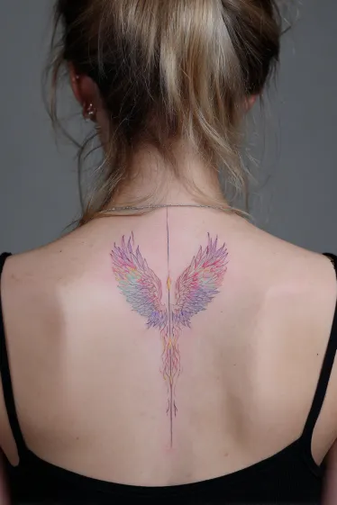 This stunning tattoo features a delicate phoenix design stretching gracefully down the spine. The wings are a beautiful blend of soft pastel and rainbow hues, creating a watercolor effect that looks incredibly ethereal. A single, thin line extends from the phoenix, flowing elegantly down the length of the spine, giving the whole piece a truly dainty and artistic feel.
